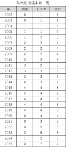 年代別の映画・ドラマ出演本数を表にまとめてみました。